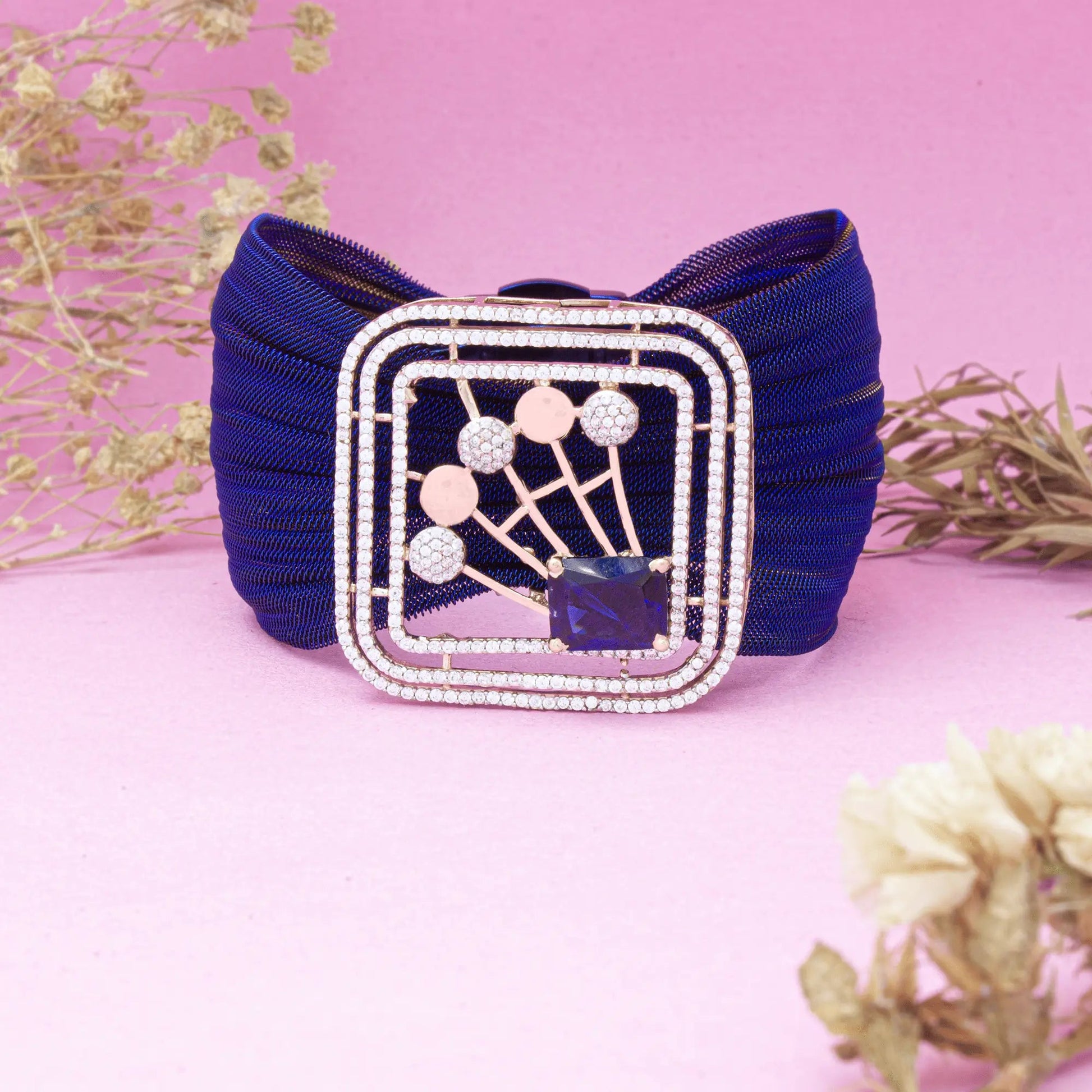 Featuring a bold square centerpiece adorned with floral stems and a brilliant-cut navy gem, this bracelet is crafted using premium 925 silver with delicate rose gold touches. Set on a rich royal blue mesh band, it embodies both romantic bracelet charm and minimalistic silver jewelry finesse. Packaged in an Aneytri signature gift box for a luxurious unboxing experience.