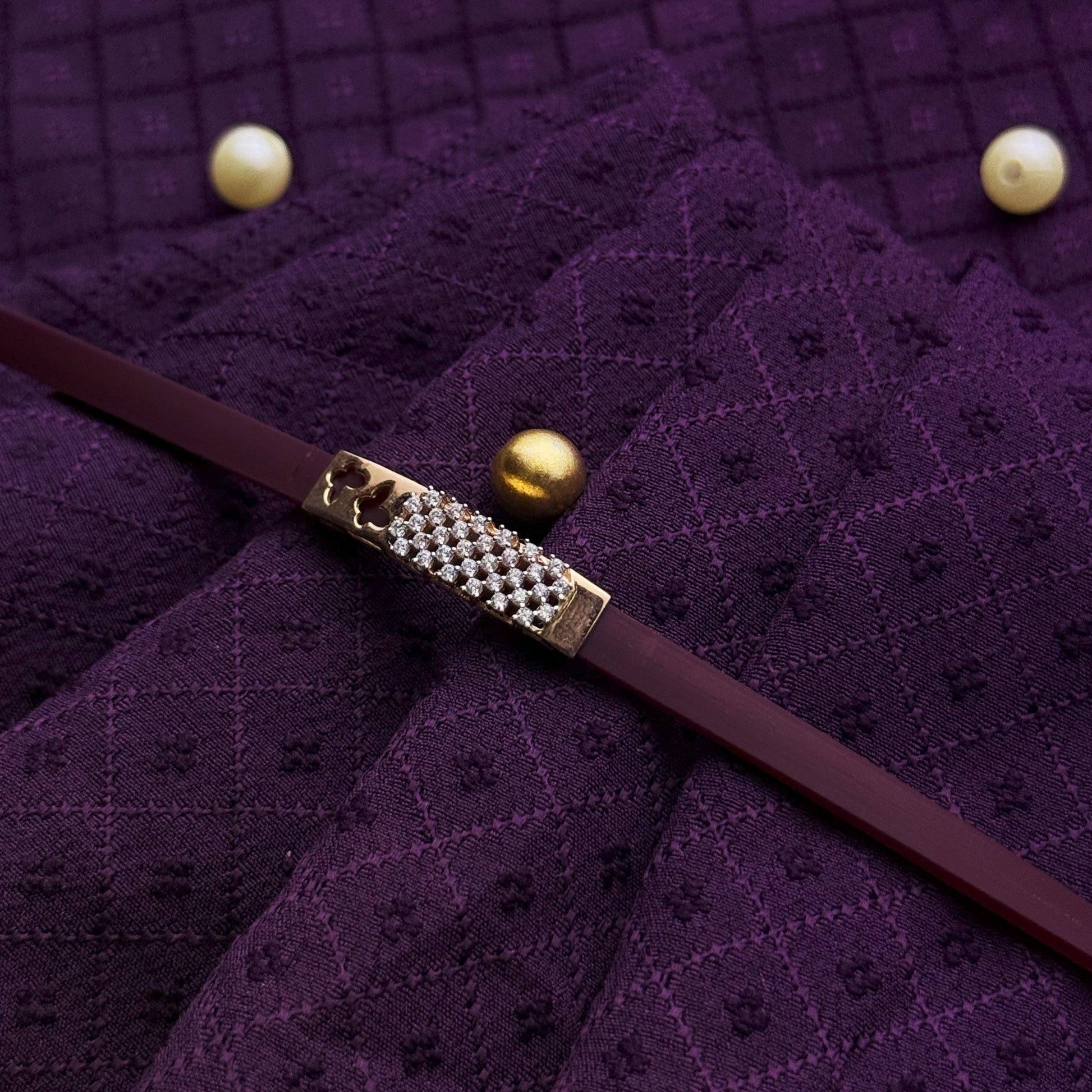 Handcrafted in 92.5 stamped silver and finished in radiant rose gold, this Rakhi features a checkerboard CZ stone design paired with laser-cut butterfly accents. Set against a deep maroon matte silicone band, the piece feels rich, luxurious, and wearable beyond the occasion. Delivered in Aneytri’s premium Rakhi box, it’s an elegant keepsake of modern tradition.
