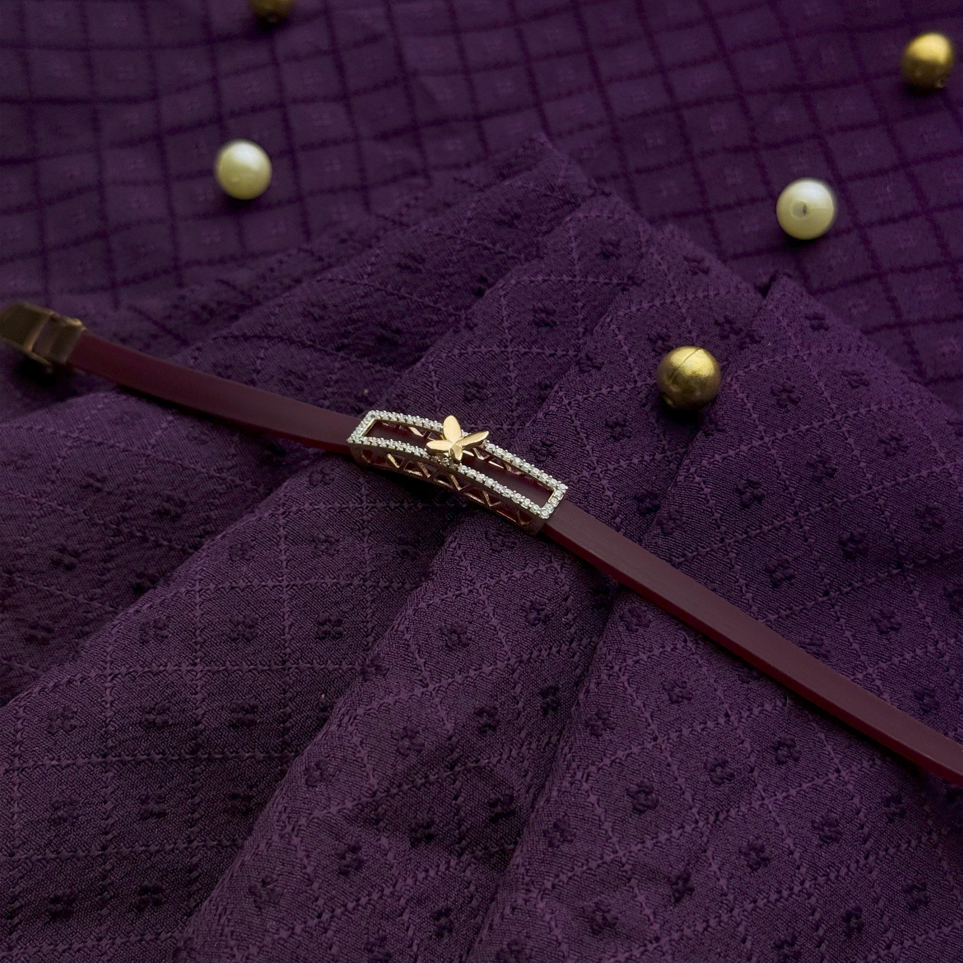 This premium Rakhi features a rose gold butterfly motif embedded in a shimmering rectangle of CZ diamonds, all crafted in 92.5 stamped silver. The charm is mounted on a soft, comfortable maroon matte silicone band for a stylish, adjustable fit. It comes beautifully packaged in Aneytri’s signature gift box — ideal for a heartfelt Raksha Bandhan surprise.