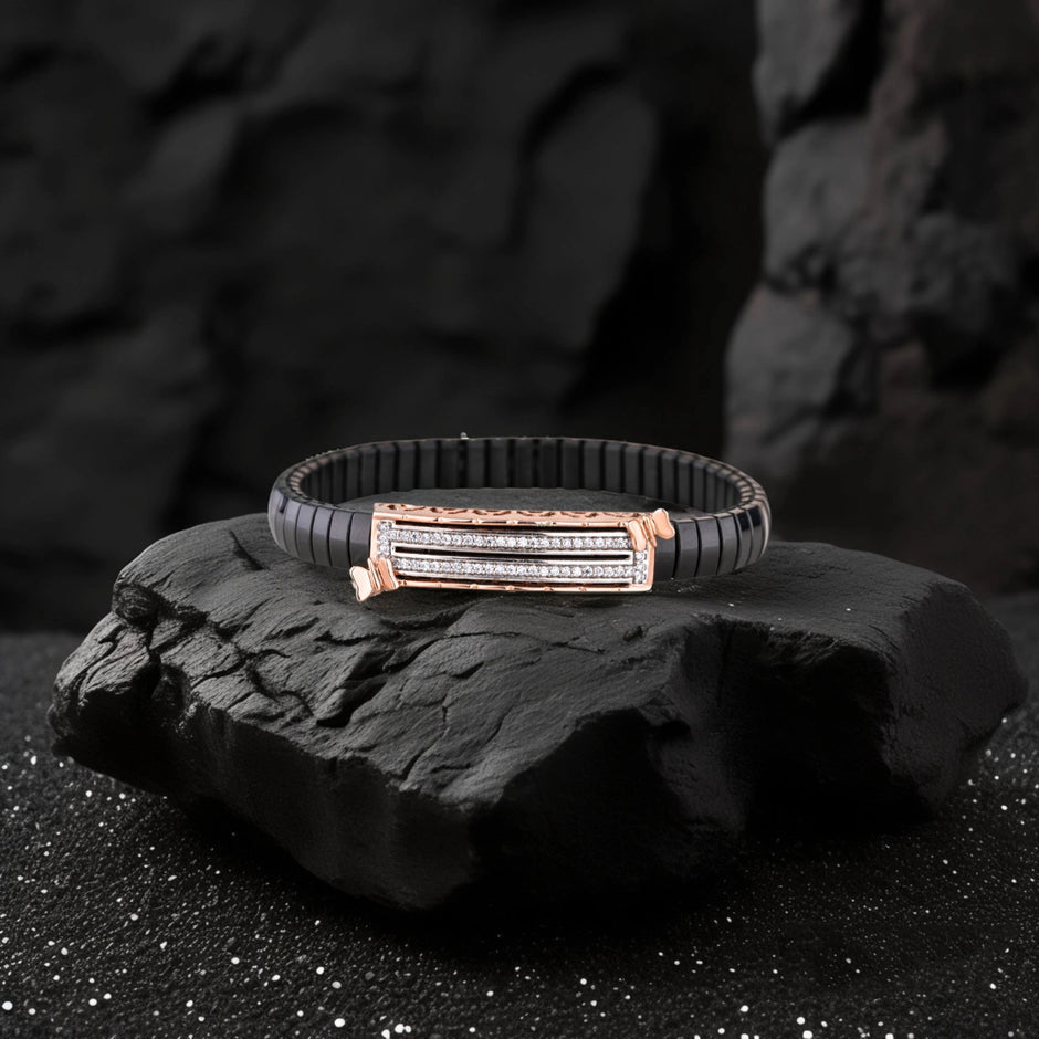 Embrace the timeless charm of tradition with our 925 Silver Champa Classic Line Bracelet. This masterpiece features a bold black strap with a rose-gold floral-inspired rectangular clasp, elegantly detailed with fine line engraving and brilliant stone accents. Crafted in pure 925 sterling silver, this bracelet stands out in global searches like "925 silver bracelet for daily wear", "traditional flower design bracelet", "luxury silver bracelet", and "black strap silver jewelry". Its graceful design honors classic artistry while ensuring a contemporary fit—perfect for festive looks and everyday elegance.