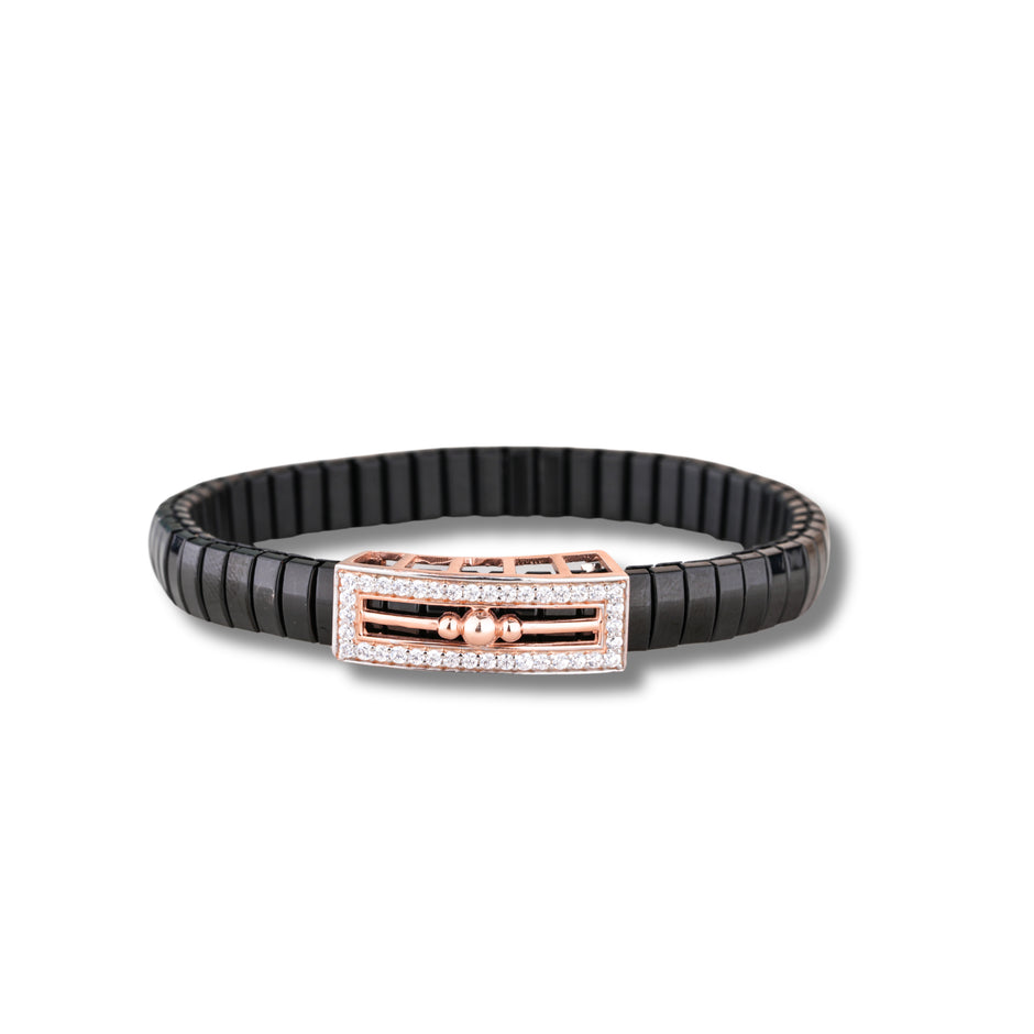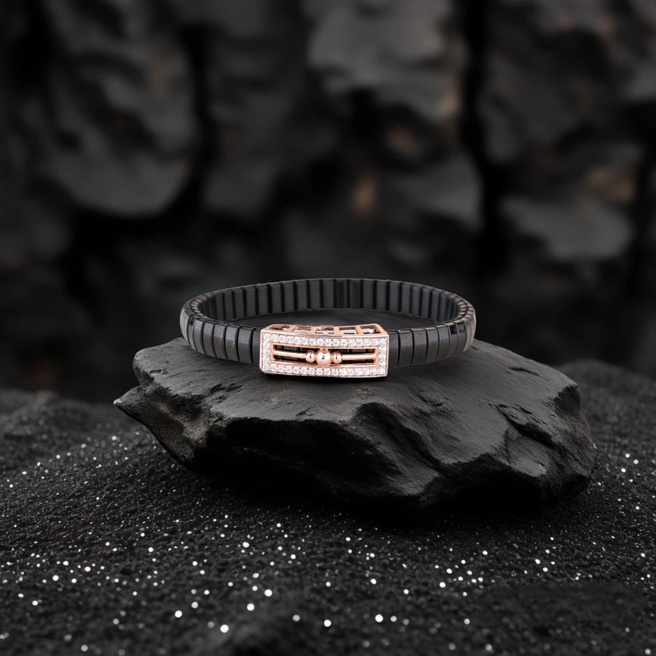 Introducing the 925 Silver Gulab Bead-Line Bracelet, inspired by the traditional beauty of floral motifs and modern minimalism. Designed with a solid black strap and a rose-gold finish rectangular clasp featuring dual bead accents and line detailing, this piece symbolizes timeless elegance and cultural roots. Perfect for those searching worldwide for "925 silver bracelet", "traditional floral jewelry", "black strap silver bracelet", "beaded silver bracelet", and "luxury handcrafted silver accessories", this bracelet delivers quality, comfort, and luxury in every wear.