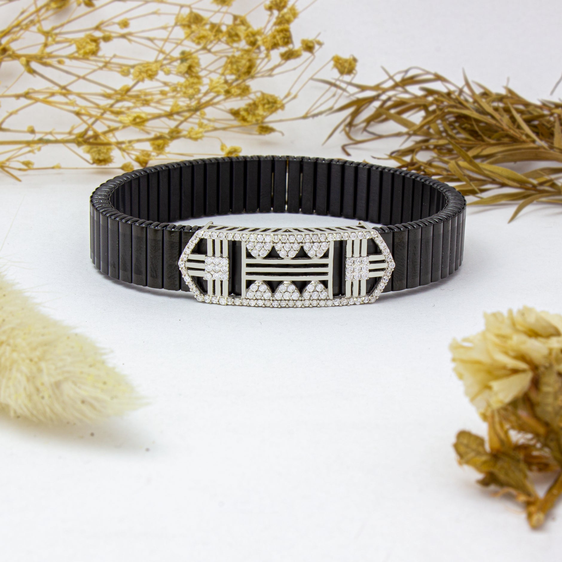 Introducing the Marigold Crest 925 Silver Bracelet, a bold expression of heritage and luxury. This bracelet showcases a geometric traditional marigold-inspired crest, crafted with premium 925 sterling silver and mounted on a durable black band. The sharp, symmetrical design adds a regal touch, making it ideal for those looking for unique silver bracelet designs, trending jewelry styles, handcrafted silver accessories, designer bracelets online, and luxurious fashion jewelry. Engineered for comfort and elegance, it’s a must-have for anyone who appreciates statement jewelry with deep-rooted cultural significance.